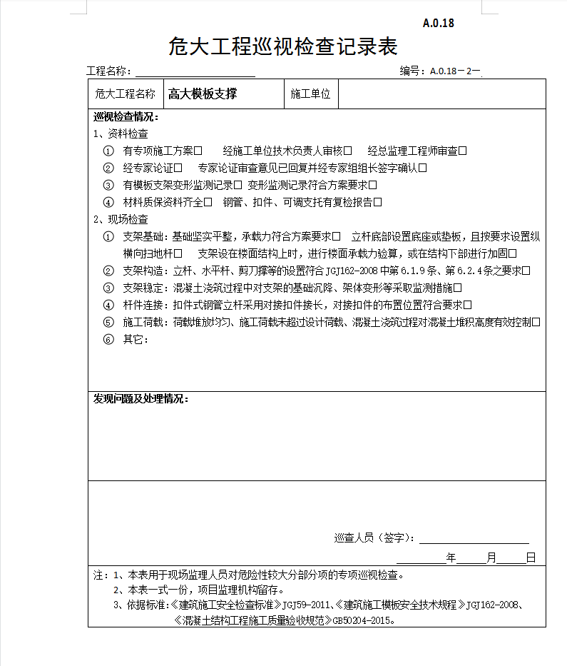 危大工程巡视检查记录仅供大家参考。
