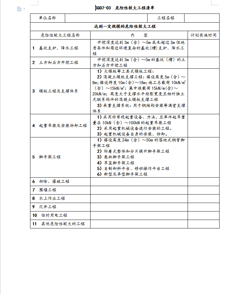 施工技术管理(安全技术交底单)表式的主要内容是:危险性较大工程清单、超过一定规模的危险性较大工程清单、专项施工方案报审表、超过一定规模的危险性较大单项工程专项施工方案专家论证审查表、安全技术交底汇总表等。