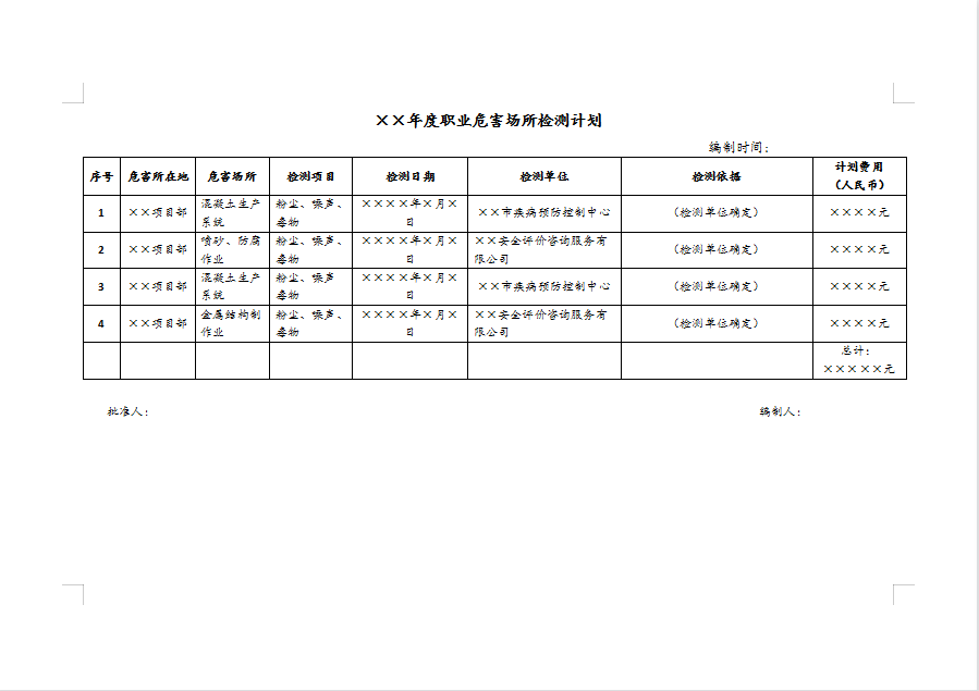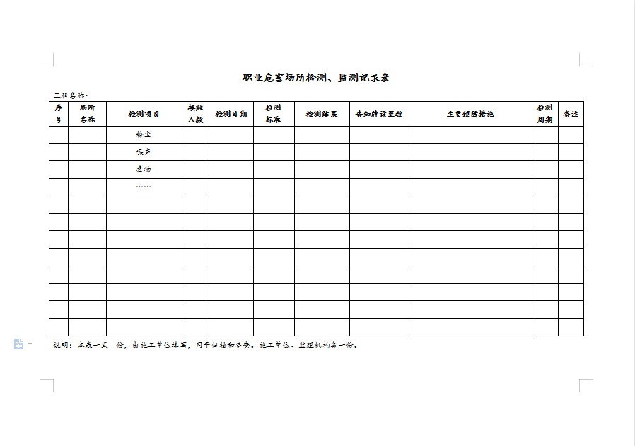 职业危害场所检测、监测记录表的主要内容是:年度职业危害场所检测计划、职业危害场所检测、监测记录表。