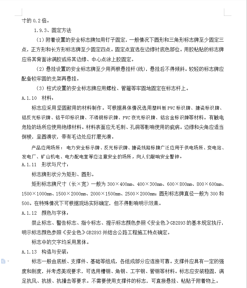 标志一般由底板、支撑件、基础等组成,各组成部分应连接可靠。支撑件应具有一定的强度和刚度,并考虑美观要求,可选用槽钢、角钢、工字钢、管钢等材料。标志应安装稳固,满足抗风、抗拔、抗撞击等要求。不需要使用支撑件的标志,可直接悬挂、粘贴于附着物上。