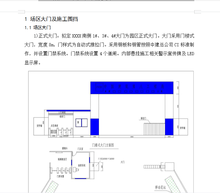 建筑工程施工临建设施专项方案内容主要包括场区大门及施工围挡、办公区、工人生活区、施工道路、材料堆场及加工棚、其他临时设施、样板展示区、垃圾集中点、施工现场照明、景观绿化、视频监控与音响广播、交通工具及停车场、物业管理细则、布置图附