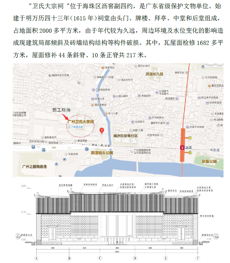 占地面积2000多平方米,由于年代较为久远,周边环境及水位变化的影响造成现建筑局部倾斜及砖墙结构结构等构件破损。其中,瓦屋面检修1682多平方米,屋面修补44条斜脊、10条正脊共217米。