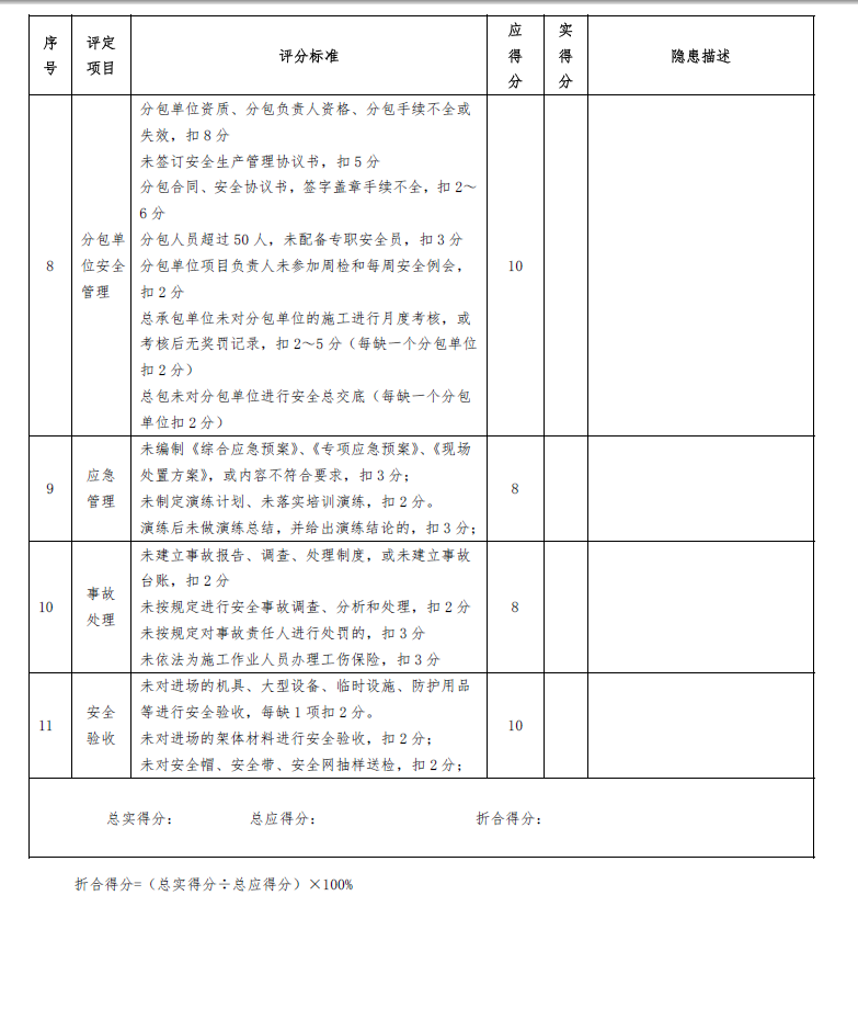 建筑施工安全检查表包括施工安全达标检查汇总表、项目安全生产管理综合检查评分表、施工现场安全达标检查评价表、施工现场安全达标检查评价表、施工现场安全达标检查评价表