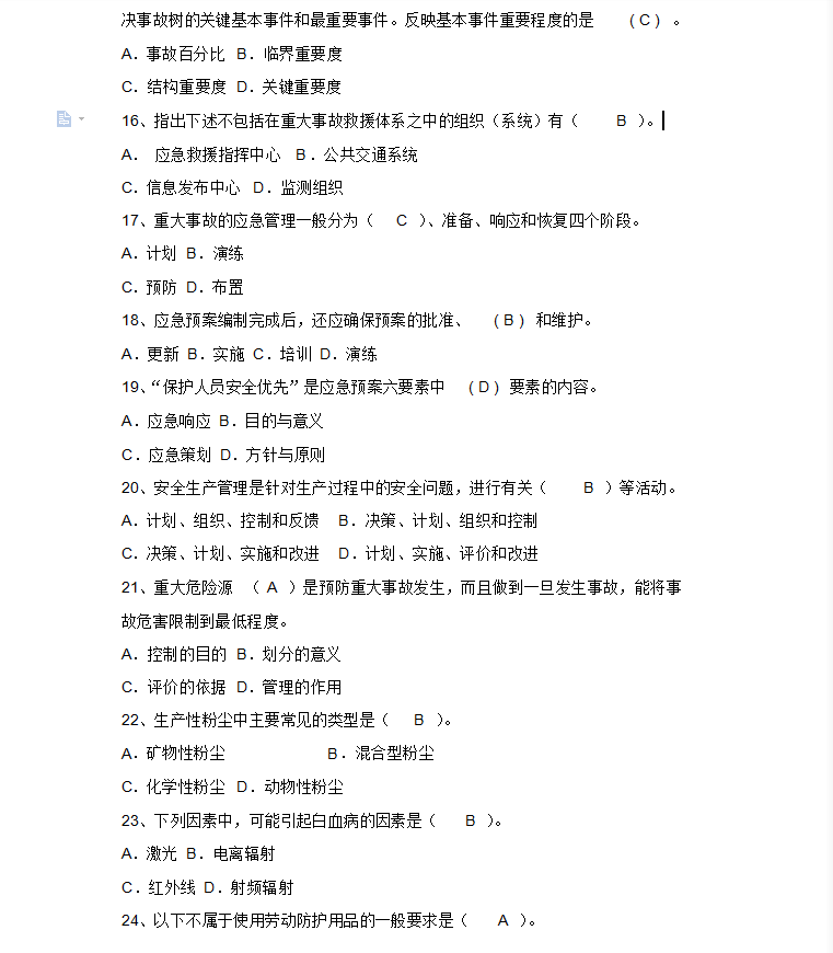 A.人、机、环境、管理、信息; B.人、物、能量、信息、设备C.安全文化、安全法制、安全责任、安全科技、安全投入; D.监察、监管、教育、培训、工程。