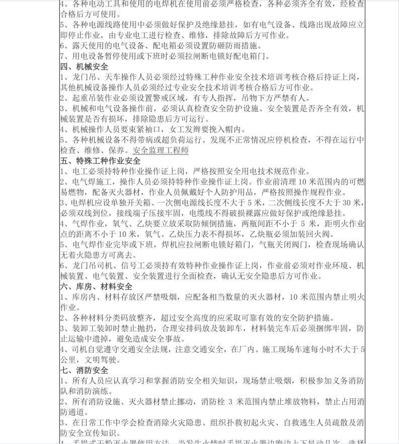 所有进入场施工人员必须经过安全教育培训考核合格,作业前经过安全技术交底后方可进入现场施工作业。作业人员应认真学习和掌握所在工种的安全技术操作规程及有关方面的安全知识,自觉遵守安全生产的各项规章制度,听从安全管理人员的指导。进入现场必须正确佩戴安全帽,系好帽带。高处作业必须系挂安全带,安全带必须系挂牢固,高挂底用。
