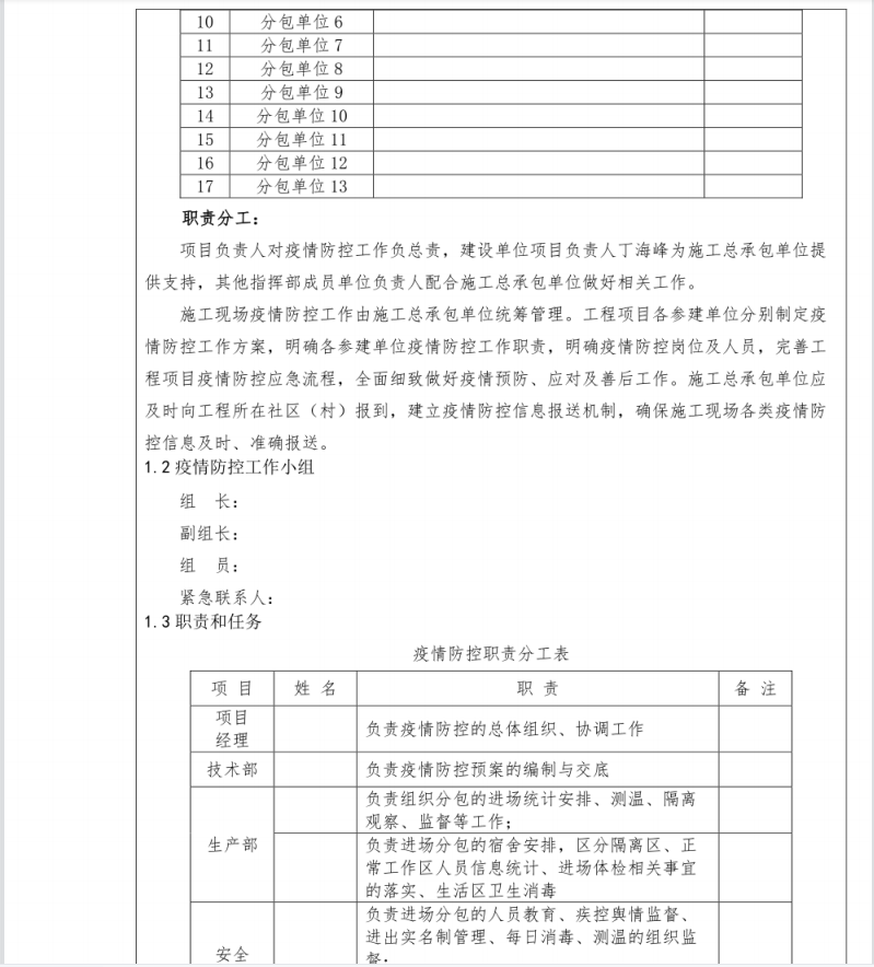 施工现场疫情防控工作由施工总承包单位统筹管理。工程项目各参建单位分别制定疫情防控工作方案,明确各参建单位疫情防控工作职责,明确疫情防控岗位及人员,完善工程项目疫情防控应急流程,全面细致做好疫情预防、应对及善后工作。施工总承包单位应.及时向工程所在社区(村)报到,建立疫情防控信息报送机制,确保施工现场各类疫情防控信息及时、准确报送。