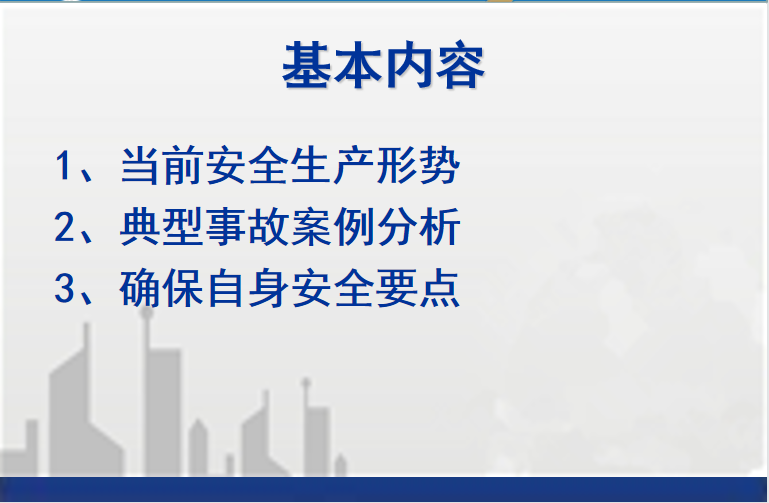 建筑施工生产安全事故典型案例巡讲主要包括当前安全生产形势、典型事故案例分析、确保自身安全要点