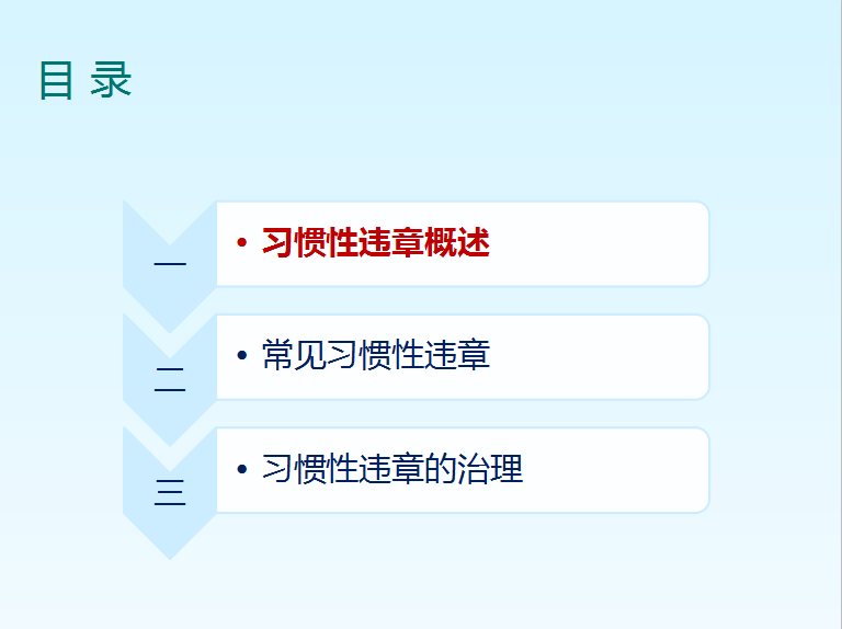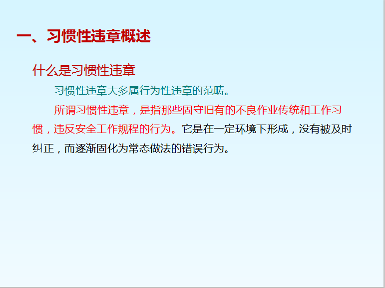 所谓习惯性违章,是指那些固守旧有的不良作业传统和工作习惯,违反安全工作规程的行为。它是在一定环境下形成,没有被及时纠正,而逐渐固化为常态做法的错误行为。