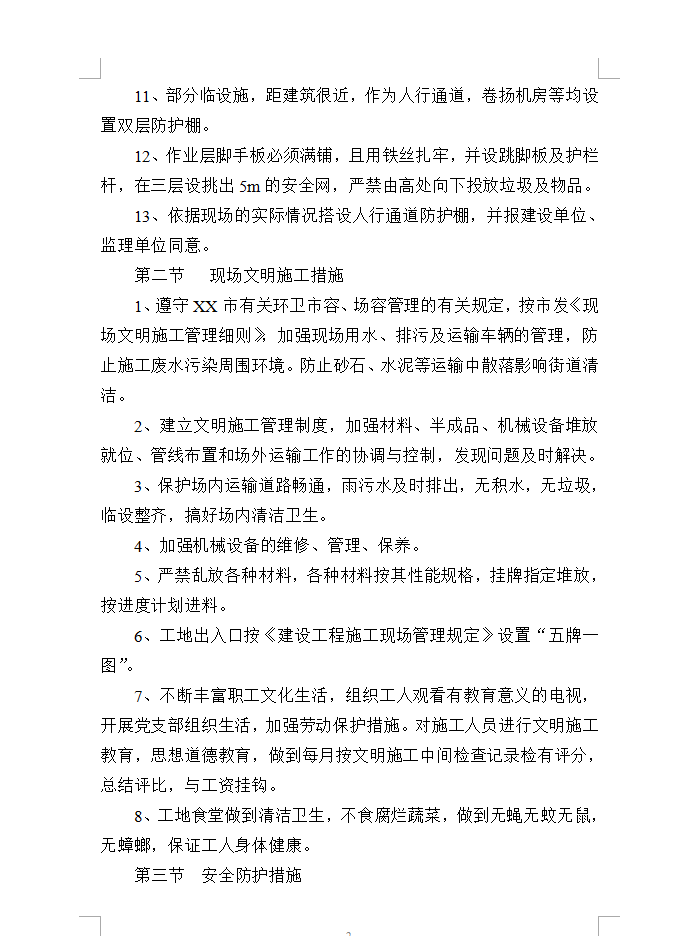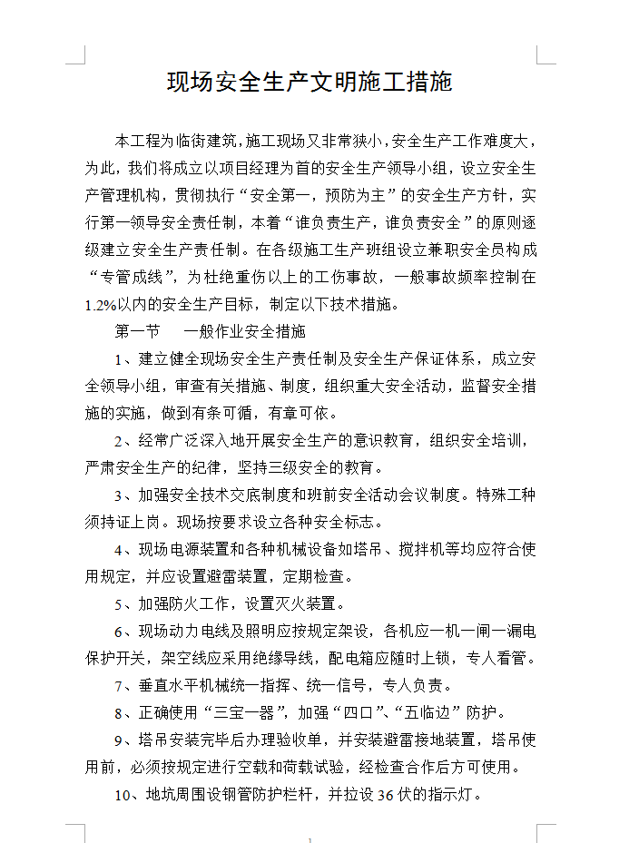 一般作业安全措施:1、建立健全现场安全生产责任制及安全生产保证体系,成立安全领导小组,审查有关措施、制度,组织重大安全活动,监督安全措施的实施,做到有条可循,有章可依。2、经常广泛深入地开展安全生产的意识教育,组织安全培训,严肃安全生产的纪律,坚持三级安全的教育。3、加强安全技术交底制度和班前安全活动会议制度。特殊工种须持证上岗。现场按要求设立各种安全标志。4、现场电源装置和各种机械设备如塔吊、搅拌机等均应符合使用规定,并应设置避雷装置,定期检查。5、加强防火工作,设置灭火装置。6、现场动力电线及照明应按规定架设,各机应一机一闸一漏电保护开关,架空线应采用绝缘导线,配电箱应随时上锁,专人看管。