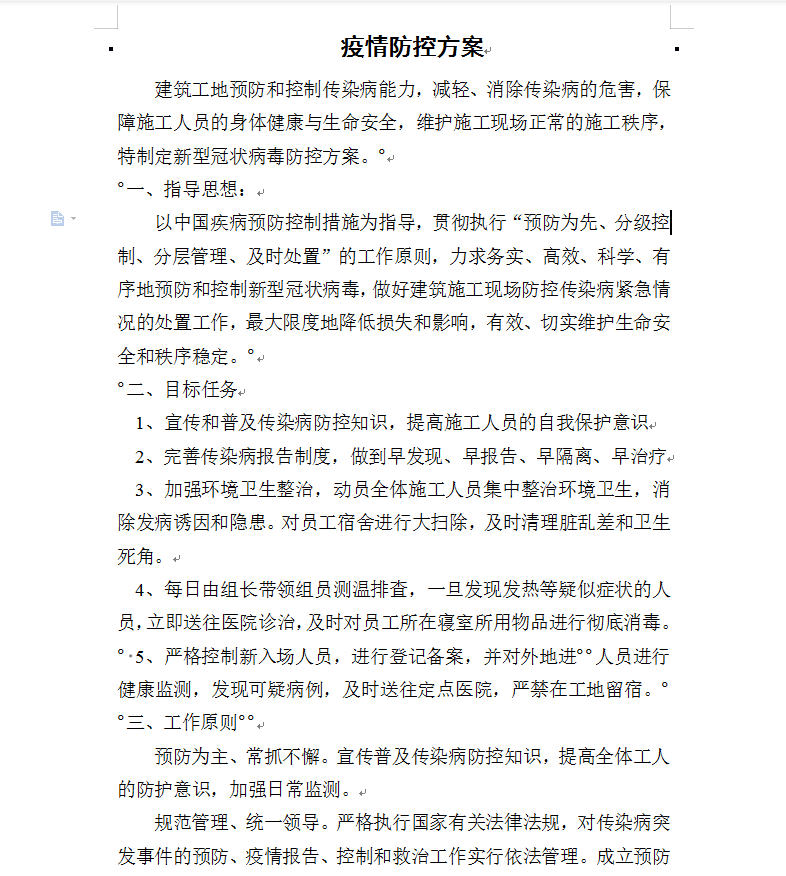 以中国疾病预防控制措施为指导,贯彻执行“预防为先、分级控制、分层管理、及时处置”的工作原则,力求务实、高效、科学、有序地预防和控制新型冠状病毒,做好建筑施工现场防控传染病紧急情况的处置工作,最大限度地降低损失和影响,有效、切实维护生命安全和秩序稳定。