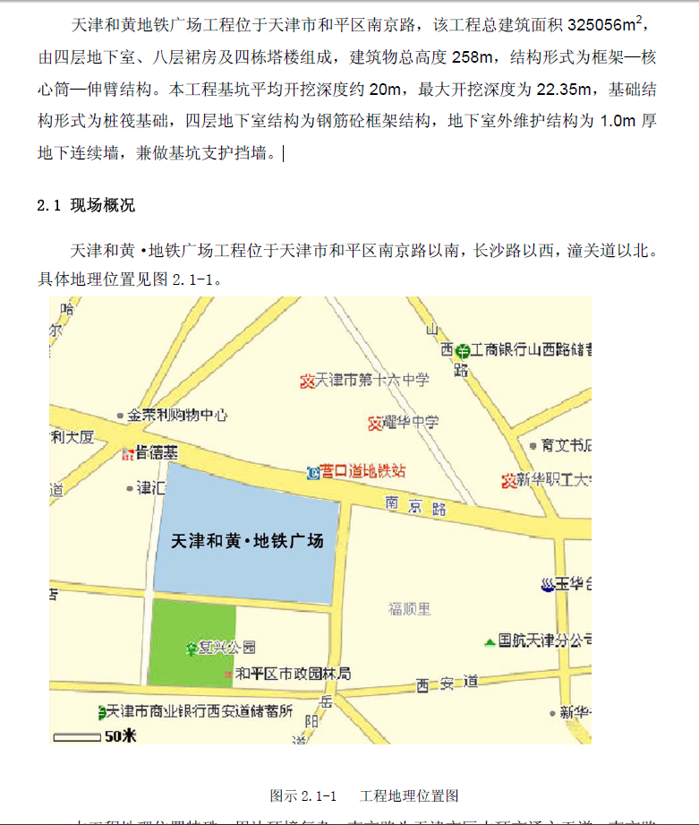 该工程总建筑面积 325056m2,由四层地下室、八层裙房及四栋塔楼组成,建筑物总高度258m,结构形式为框架—核心筒—伸臂结构。本工程基坑平均开挖深度约20m,最大开挖深度为22.35m,基础结构形式为桩筏基础,四层地下室结构为钢筋砼框架结构,地下室外维护结构为1.0m 厚地下连续墙,兼做基坑支护挡墙。