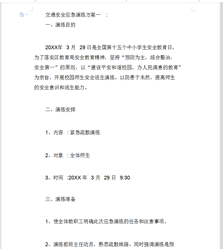 20XX年 3 月 29 日是全国第十五个中小学生安全教育日,为了落实区教育局安全教育精神,坚持“预防为主,综合整治,安全第一”的原则,以“建设平安和谐校园,办人民满意的教育” 为宗旨,开展校园师生安全逃生演练,以防患于未然,提高师生的安全意识和逃生能力。