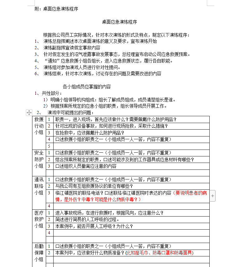 组织桌面演练目的:检验员工对安全事故应急救援预案内容的掌握程度,提高员工对安全事故的应急处理能力及应急救援知识的认识。