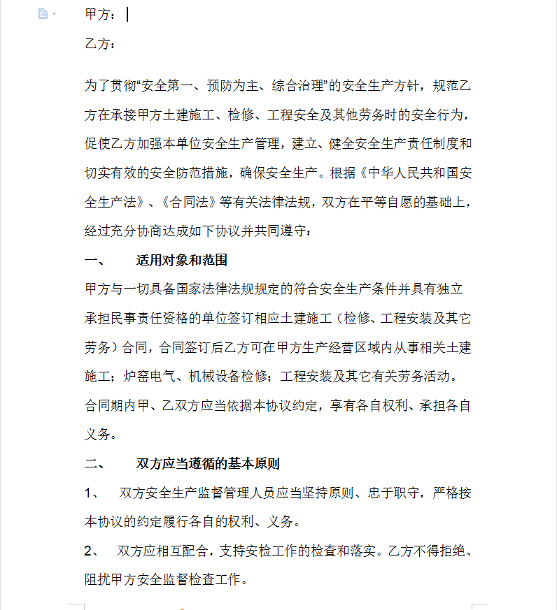为了贯彻“安全第一、预防为主、综合治理”的安全生产方针,规范乙方在承接甲方土建施工、检修、工程安全及其他劳务时的安全行为,促使乙方加强本单位安全生产管理,建立、健全安全生产责任制度和切实有效的安全防范措施,确保安全生产。根据《中华人民共和国安全生产法》、《合同法》等有关法律法规,双方在平等自愿的基础上,经过充分协商达成如下协议并共同遵守。