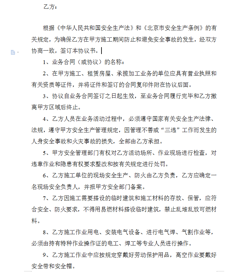 乙方人员在业务活动过程中,必须遵守国家有关安全生产法律、法规,遵守甲方安全生产管理规定,因管理不善或“三违”工作而发生的人身安全事故和火灾事故的损失,全部由乙方承担。甲方安全管理部门有权对乙方活动场所、作业现场进行检查,对违章作业和隐患有权要求整改和按有关规定进行处罚。