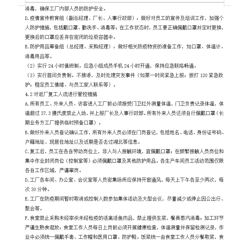 为了确保新型冠状肺炎疫情等应急防控工作,特制定公司应急预案。董事长任应急工作组组长,负责此次防疫工作的全面部署,并协调各项工作,确定应急处置点的位置;总经理任副组长,副总经理、厂长、厂长助理、人事行政部、各部门主管任组员。进行人员管控、环境消毒,疫情宣传,物资筹备等方面工作,确保公司所有的疫情防护措施做到位。