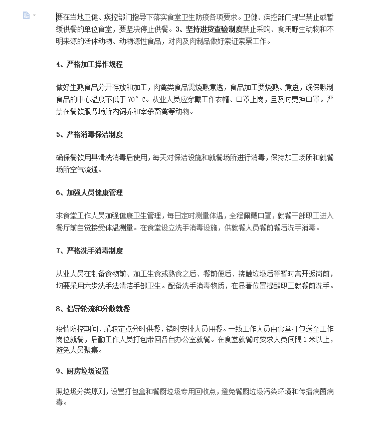 要在当地卫健、疾控部门指导下落实食堂卫生防疫各项要求。卫健、疾控部门提出禁止或暂缓供餐的单位食堂,要坚决停止供餐。坚持进货查验制度禁止采购、食用野生动物和不明来源的活体动物、动物源性食品,对肉及肉制品做好索证索票工作。