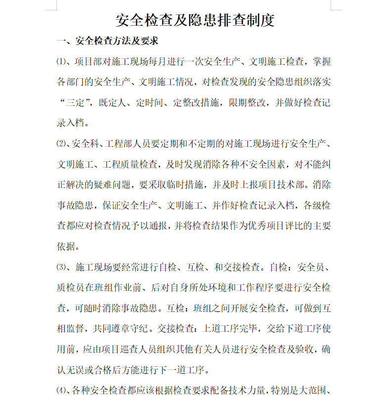 安全科、工程部人员要定期和不定期的对施工现场进行安全生产、文明施工、工程质量检查,及时发现消除各种不安全因素,对不能纠正解决的疑难问题,要采取临时措施,并及时上报项目技术部。消除事故隐患,保证安全生产、文明施工、并作好检查记录入档,各级检查都应对检查情况予以通报,并将检查结果作为优秀项目评比的主要依据。