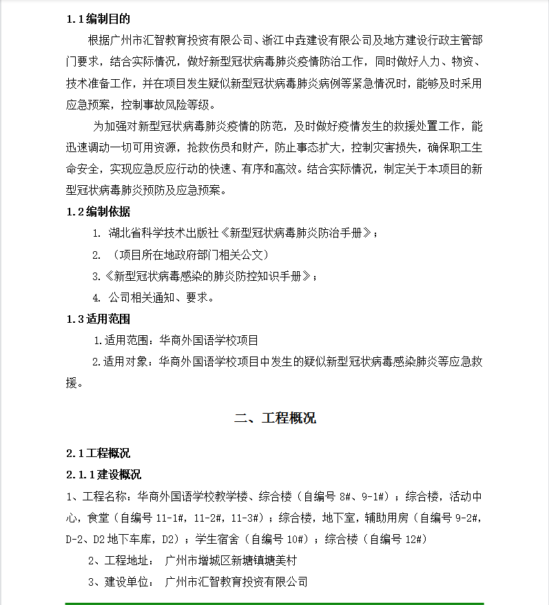 本项目总建筑面积53620.6㎡ ,地上2至6层,地下1层,项目用工人数约80人,居住在职工生活区、生产及住宿人员比较集中。本预案所称新型冠状病毒肺炎是指:根据国家卫生健康委员会网站1月28日凌晨发布新型冠状病毒感染的肺炎诊疗方案(试行第四版),具有以下病原学证据之一者:呼吸道标本或血液标本实时荧光RT-PCR检测新型冠状病毒核酸阳性;呼吸道标本或血液标本病毒基因测序,与已知新型冠状病毒高度同源。
