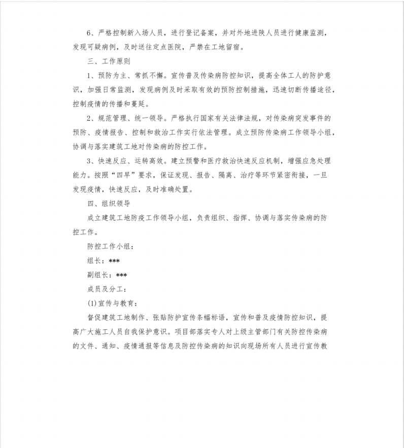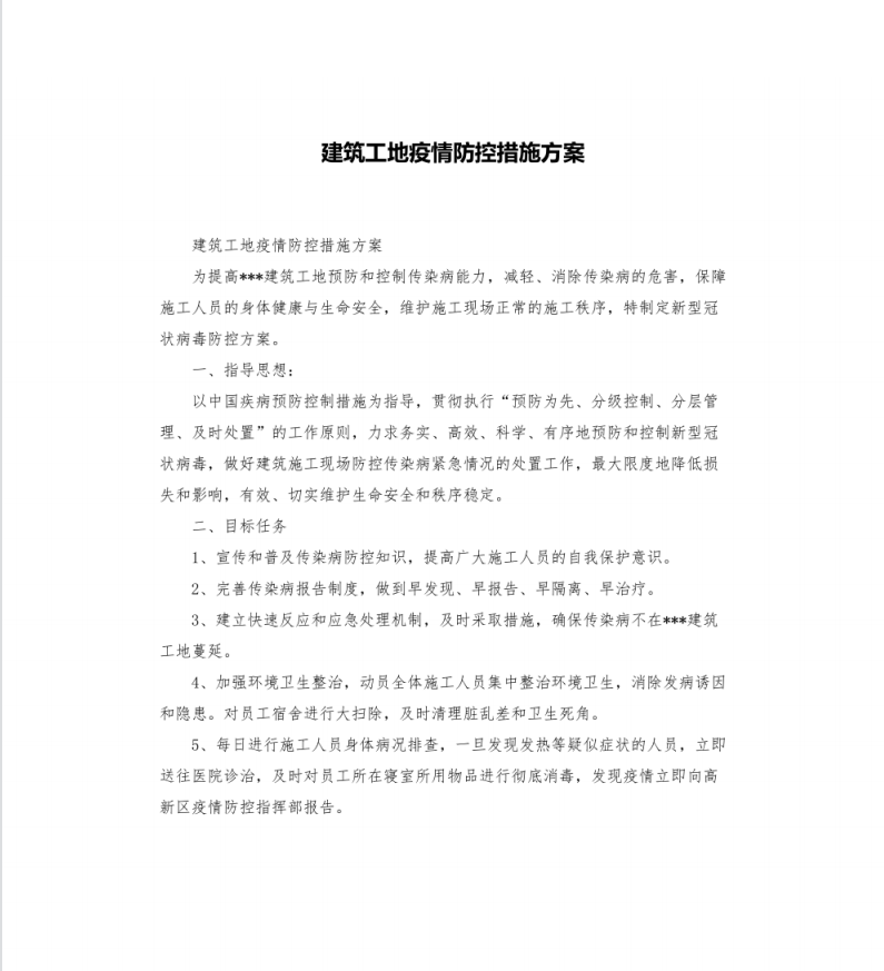 ΪÌá¸ß***½¨Öþ¹¤µØÔ¤·ÀºÍ¿ØÖÆ´«È¾²¡ÄÜÁ¦£¬¼õÇá¡¢Ïû³ý´«È¾²¡µÄΣº¦£¬±£ÕÏÊ©¹¤ÈËÔ±µÄÉíÌ彡¿µÓëÉúÃü°²È«£¬Î¬»¤Ê©¹¤ÏÖ³¡Õý³£µÄÊ©¹¤ÖÈÐò£¬ÌØÖƶ¨ÐÂÐ͹Ú×´²¡¶¾·À¿Ø·½°¸¡£