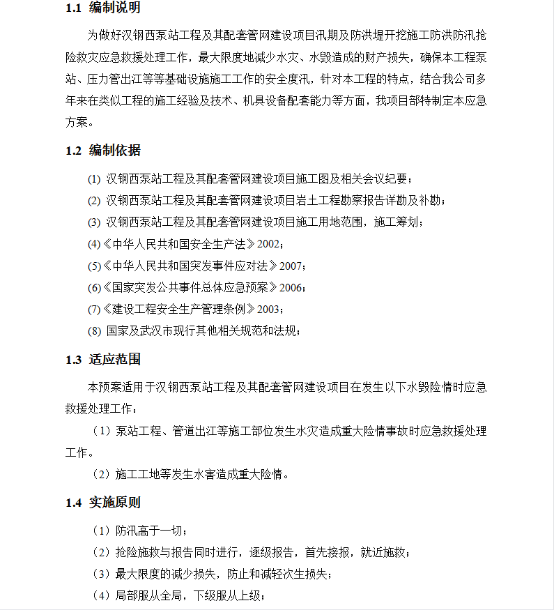 本预案适用于xxx泵站工程及其配套管网建设项目在发生以下水毁险情时应急救援处理工作:泵站工程、管道出江等施工部位发生水灾造成重大险情事故时应急救援处理工作。施工工地等发生水害造成重大险情。