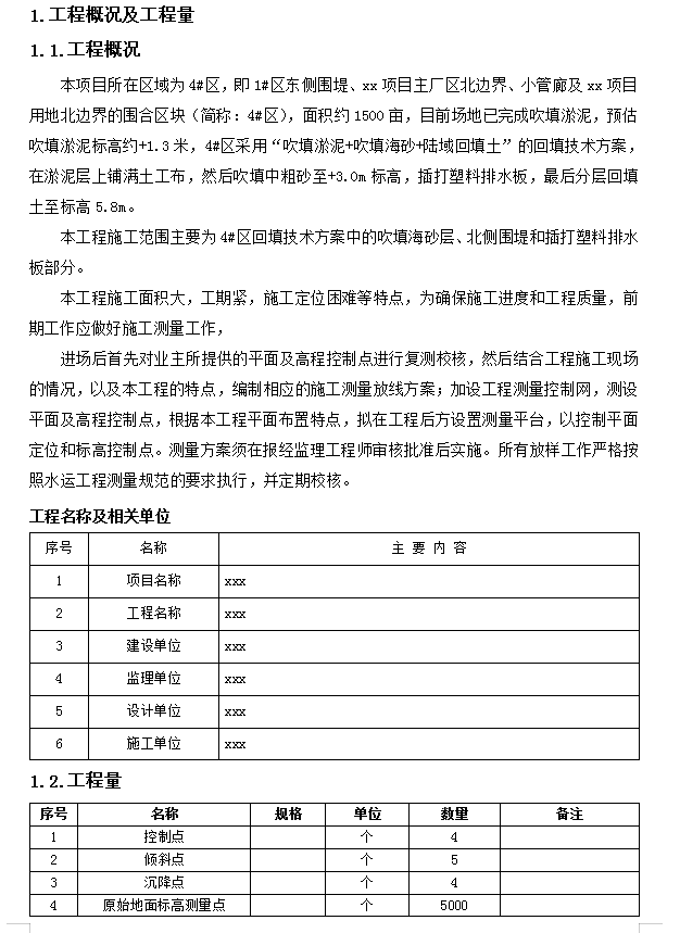 本项目所在区域为4#区,即1#区东侧围堤、xx项目主厂区北边界、小管廊及xx项目用地北边界的围合区块(简称:4#区),面积约1500亩,目前场地已完成吹填淤泥,预估吹填淤泥标高约+1.3米,4#区采用“吹填淤泥+吹填海砂+陆域回填土”的回填技术方案,在淤泥层上铺满土工布,然后吹填中粗砂至+3.0m标高,插打塑料排水板,最后分层回填土至标高5.8m。