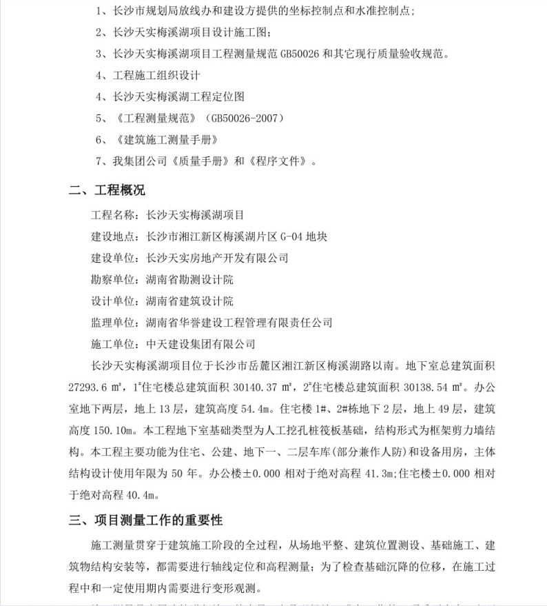 本工程地下室总建筑面积27293.6 m',1°住宅楼总建筑面积30140.37 m’,2住宅楼总建筑面积30138. 54 m。办公室地下两层,地上13层,建筑高度54. 4m。住宅楼1#、2#栋地下2层,地上49层,建筑高度150. 10m。本工程地下室基础类型为人工挖孔桩筏板基础,结构形式为框架剪力墙结构。本工程主要功能为住宅、公建、地下一、二层车库(部分兼作人防)和设备用房,主体结构设计使用年限为50年。办公楼士0.000相对于绝对高程41. 3m;住宅楼士0.000相对于绝对高程40. 4m。