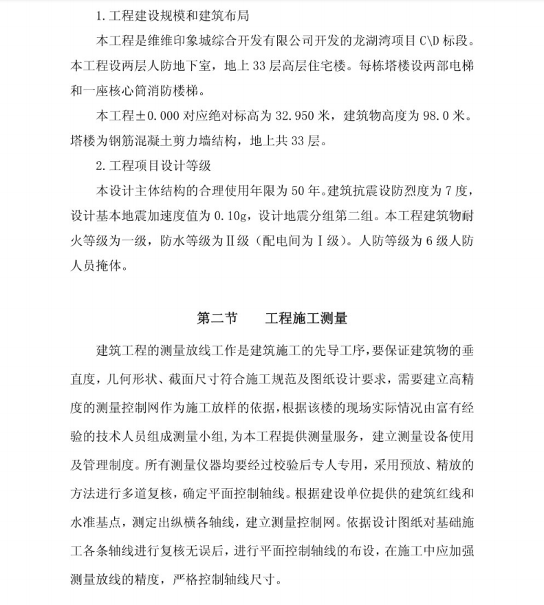 本工程设两层人防地下室,地上33层高层住宅楼。每栋塔楼设两部电梯和一座核心筒消防楼梯。本工程士0.000对应绝对标高为32. 950米,建筑物高度为98. 0米。塔楼为钢筋混凝土剪力墙结构,地上共33层。