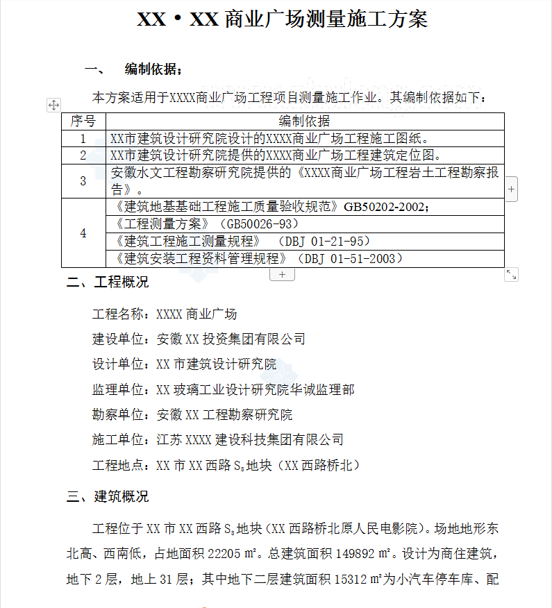 总建筑面积149892㎡。设计为商住建筑,地下2层,地上31层;其中地下二层建筑面积15312㎡为小汽车停车库、配套用房、人防,停车位399个;地下一层建筑面积16903㎡为商业及配套用房;1-4层裙楼建筑面积43966㎡为商业及配套用房; 5-31层四栋高层住宅建筑面积73711㎡为805套住宅及配套用房。结构形式为框架-剪力墙结构,主楼基础为人工挖孔灌注桩;裙楼基础为钻孔灌注桩。