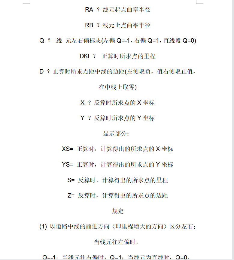 以道路中线的前进方向(即里程增大的方向)区分左右; 当线元往左偏时, Q=-1;当线元往右偏时,Q=1;当线元为直线时,Q=0。