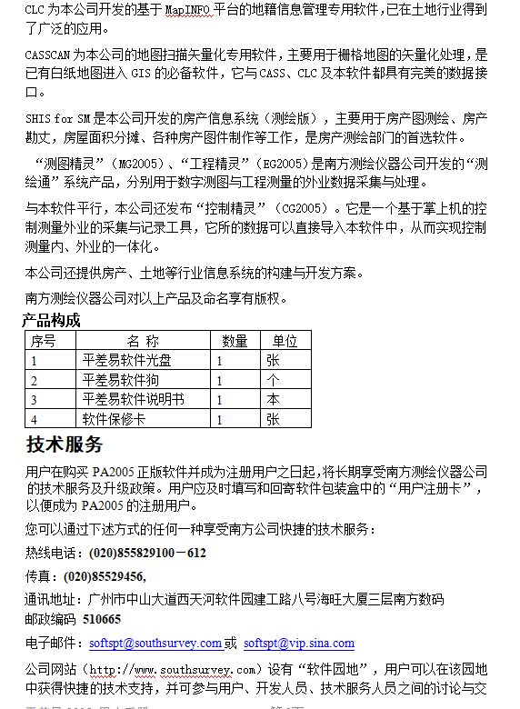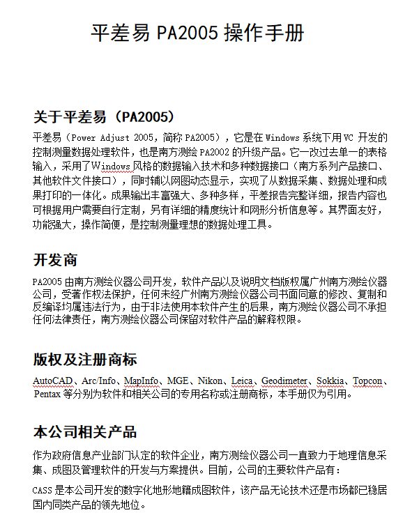 平差易(Power Adjust 2005,简称PA2005),它是在Windows系统下用VC 开发的控制测量数据处理软件,也是南方测绘PA2002的升级产品。它一改过去单一的表格输入,采用了Windows风格的数据输入技术和多种数据接口(南方系列产品接口、其他软件文件接口),同时辅以网图动态显示,实现了从数据采集、数据处理和成果打印的一体化。成果输出丰富强大、多种多样,平差报告完整详细,报告内容也可根据用户需要自行定制,另有详细的精度统计和网形分析信息等。其界面友好,功能强大,操作简便,是控制测量理想的数据处理工具。