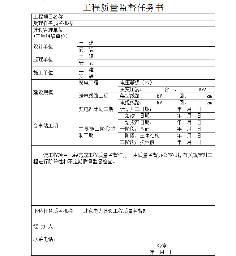 变电站工程的质量监督检查按照变电站主要建(构)筑物基础基本完成、变电站主体建筑结构工程基本完成、投运前三个阶段进行工程质量监督检查。(大型换电站工程质量监督参照变电站工程执行)