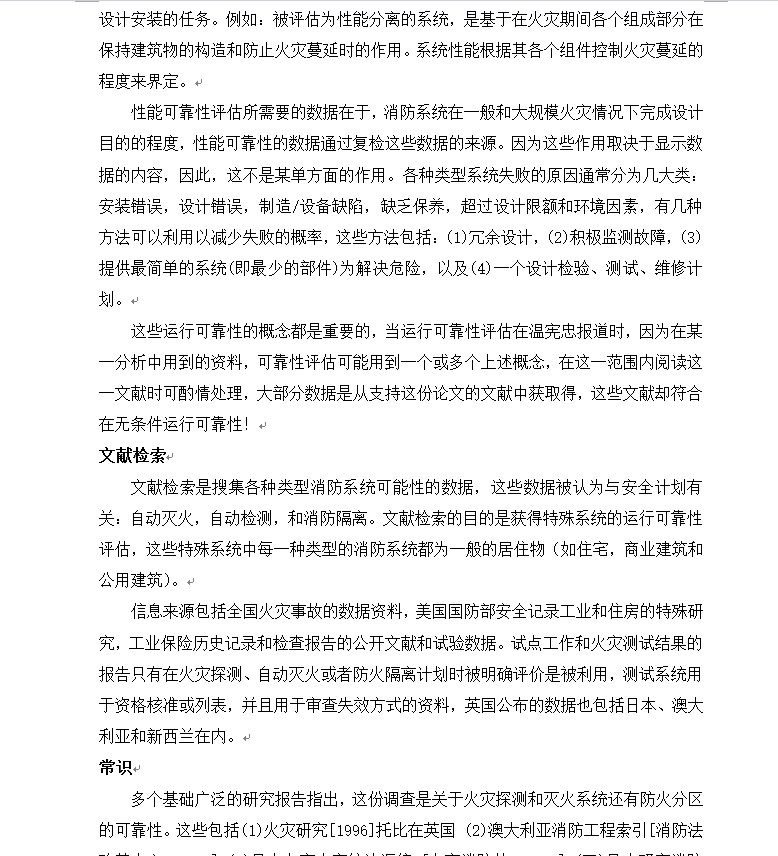 为执行特定功能而设计和安装的美国消防计划。例如,自动喷水灭火系统目的在于控制或扑灭火灾。为此: 自动灭火系统必须长开,即能满足火灾地所需水量达到控制或消灭火灾,火灾探测系统是为了尽早提供火灾预警通报来通知楼内人员安全逃生,并提供消防通知,使其他的消防组成部分开启(例如,特殊灭火系统、排烟系统)。两种消防系统启动(检测)和(警报)必须达到尽早报警。建筑防火墙的一般设计目的为:限制火灾蔓延的程度和保持建筑物的结构的完整,以及在火灾发生时保护逃生路线的安全性。为了做到这一点,特殊的消防系统必须按标准测试及保持特殊消防系统完整性的特点.。消防系统的组成部分如探测系统、自动灭火系统、防火墙的可靠性,在于提高基于设计基础上的联合演习的细节分析的投入。在安全系统方面,有几个可靠性要素包括有效和能使用的可靠性,运行可靠性能提供一定程度的概率,即消防系统在需要时运行。运行可靠性能在特定的火灾情况下利用起特点成功完成起任务的一种检测手段。前者是系统组成和可靠性的评估,而后者是系统设计适宜性的评估。