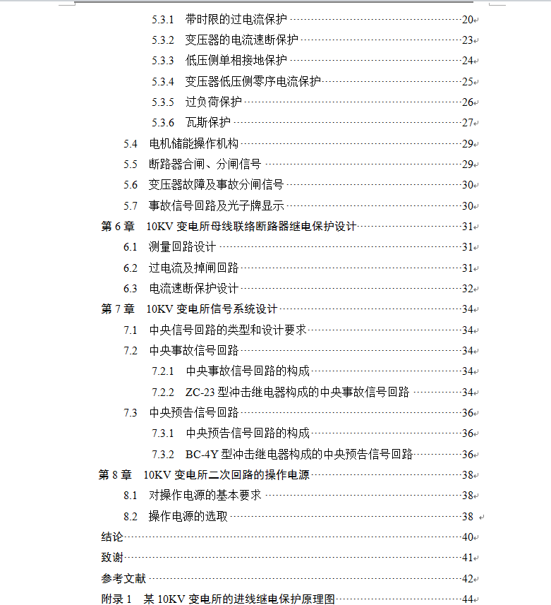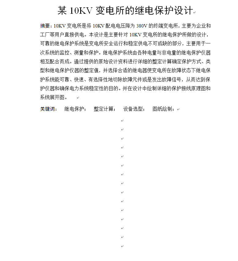 10KV变电所是将10KV配电电压降为380V的终端变电所,主要为企业和工厂等用户直接供电。本设计是主要针对10KV变电所的继电保护所做的设计,可靠的继电保护系统是变电所安全运行和稳定供电不可或缺的部分,主要用于一次系统的监控、测量和保护。继电保护系统由各种电量与非电量的继电保护仪器相互配合而成。通过提供的原始设计资料进行详细的整定计算确定保护方式、类型和继电保护仪器的整定值,并选择合适的继电器使变电所在故障状态下继电保护系统能可靠、快速、有选择性地切除故障元件或是发出故障信号,从而达到保护仪器和确保电力系统稳定性的目的。并在设计中绘制详细的保护接线原理图和系统展开图。