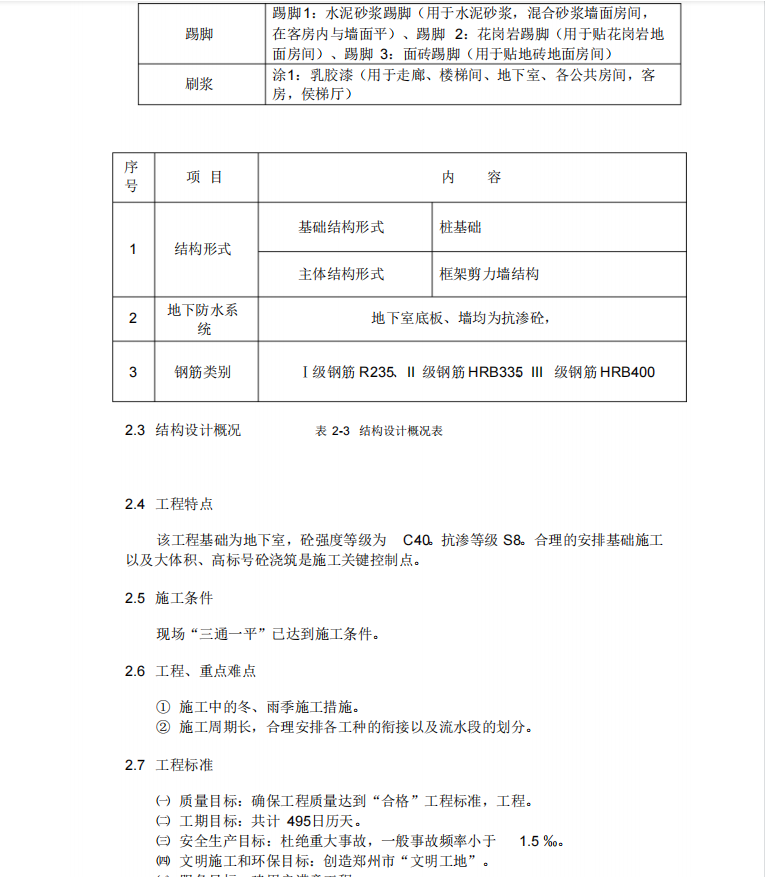 该工程基础为地下室,砼强度等级为 C40。抗渗等级 S8。合理的安排基础施工以及大体积、高标号砼浇筑是施工关键控制点。