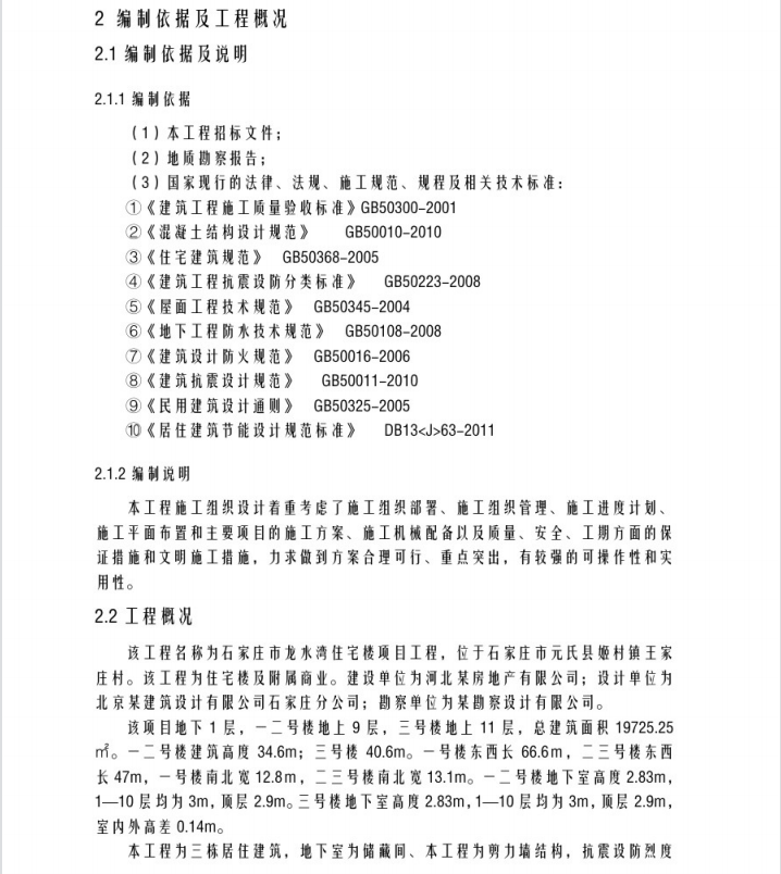 该工程名称为xxx市xxx住宅楼项目工程,位于xxx市xx县x村镇xxx村。该工程为住宅楼及附属商业。建设单位为xx某房地产有限公司。设计单位为xx某建筑设计有限公司石家庄分公司;勘察单位为某勘察设计有限公司。该项目地下1层,-二号楼地上9层,三号楼地上11层,总建筑面积19725.25。-二号楼建筑高度34.6m; 三号楼40.6m。 -号楼东西长66.6m,二三号楼东西长47m,-号楼南北宽12.8m,二三号楼南北宽13.1m。-二号楼地下室高度2.83m,1- -10层均为3m,顶层2.9m。三号楼地下室高度2.83m,1-10层均为3m,顶层2.9m,室内外高差0.14m。