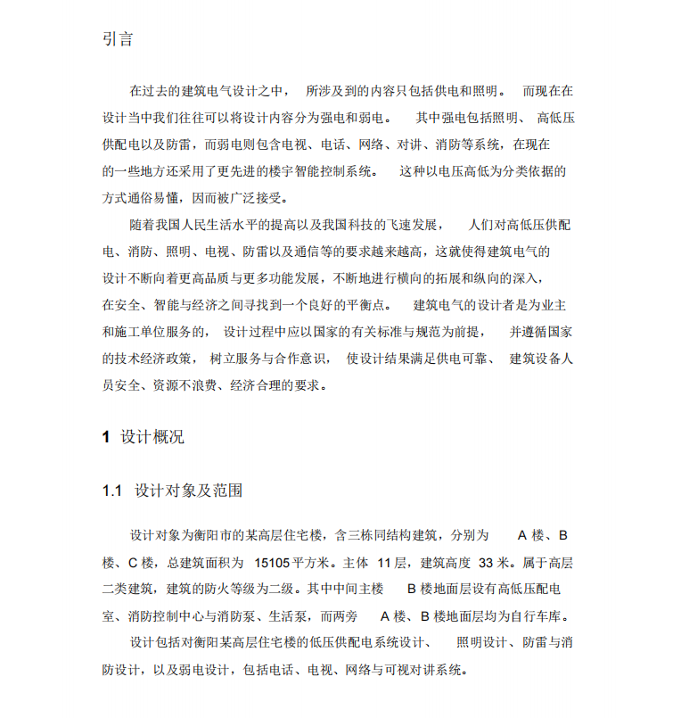 本毕业设计是对于xx某高层住宅楼的建筑电气设计。设计 以建筑电气设计相关规范为参考依据,重点在强电方面,包含负荷计算,低压设备选型,照明计算等。在设计中力求准确、合理、规范,不仅考虑到可靠性,也综合考虑了经济性,在经济投入- -定的情况下,既节省建设投资,又满足建筑应有功能,力图做到用户用电的安全可靠与便捷舒适。