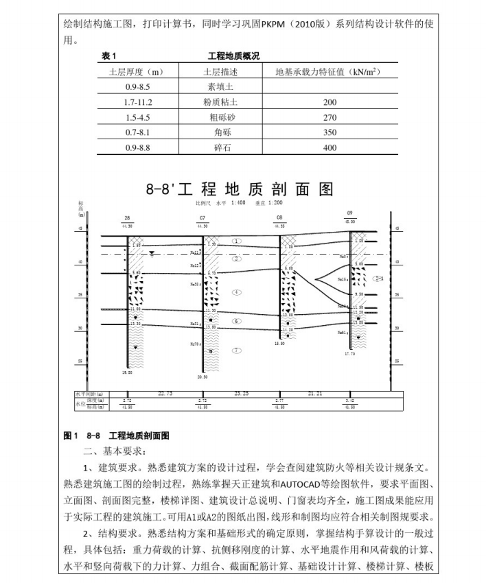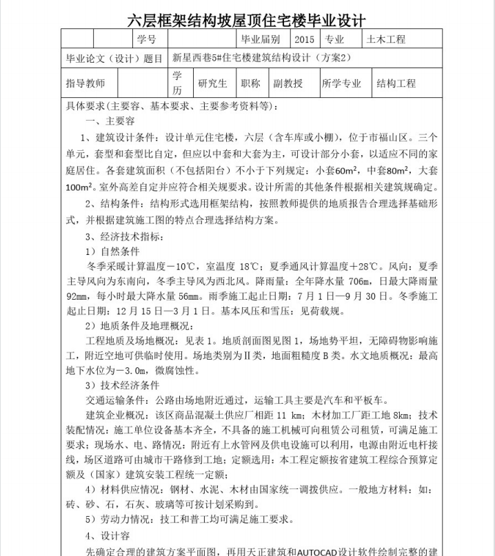 建筑设计条件:设计单元住宅楼,六层(含车库或小棚),位于市xx区。三个单元,套型和套型比自定,但应以中套和大套为主,可设计部分小套,以适应不同的家庭居住。各套建筑面积(不包括阳台)不小于下列规定:小套60m2,中套80m2,大套100m2。室外高差自定并应符合相关规要求。设计所需的其他条件根据相关建筑规确定。结构条件:结构形式选用框架结构,按照教师提供的地质报告合理选择基础形式,并根据建筑施工图的特点合理选择结构方案。