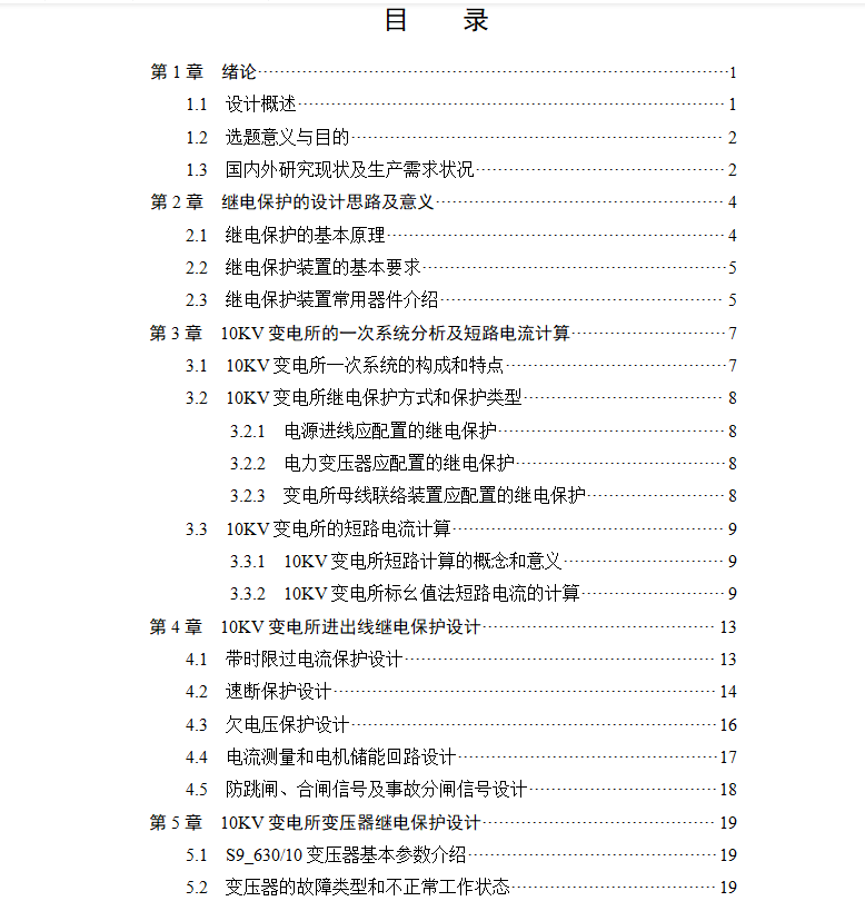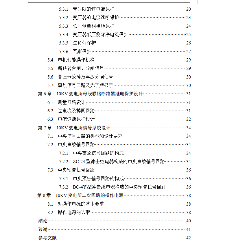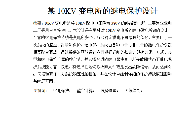 10KV变电所是将10KV配电电压降为380V的终端变电所,主要为企业和工厂等用户直接供电。本设计是主要针对10KV变电所的继电保护所做的设计,可靠的继电保护系统是变电所安全运行和稳定供电不可或缺的部分,主要用于一次系统的监控、测量和保护。继电保护系统由各种电量与非电量的继电保护仪器相互配合而成。通过提供的原始设计资料进行详细的整定计算确定保护方式、类型和继电保护仪器的整定值,并选择合适的继电器使变电所在故障状态下继电保护系统能可靠、快速、有选择性地切除故障元件或是发出故障信号,从而达到保护仪器和确保电力系统稳定性的目的。并在设计中绘制详细的保护接线原理图和系统展开图。