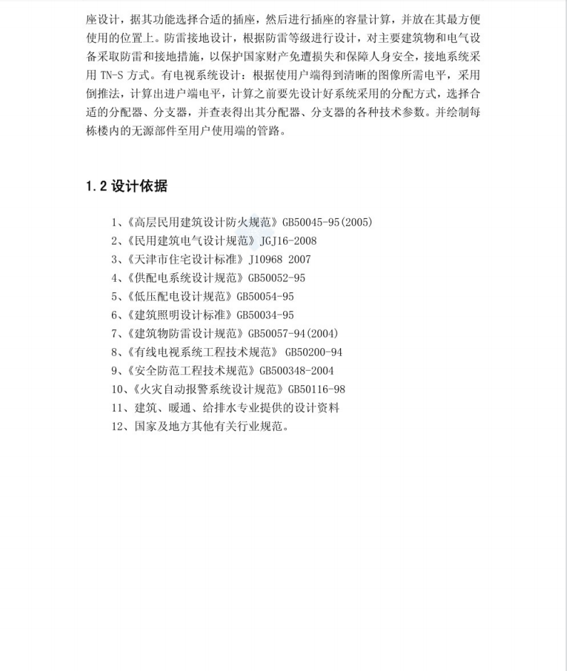 本次设计具体项目为***住宅32#楼住宅小区项目。此综合社区位于***.本设计为普通民用高层住宅,为二类高层建筑,按三级负荷供电,住宅楼梯间应急照明供电负荷等级为二级,采用集中蓄电池作为备用电源。防火等级为二级,按三类防雷建筑物设计防雷。本设计配电系统采用三相五线制电压为,380/220 伏接地形式采用TN-C-S系统进户处设重复接地,采用综合接地方式,接地利用建筑物基础作接地极,接地电阻不大于1欧。