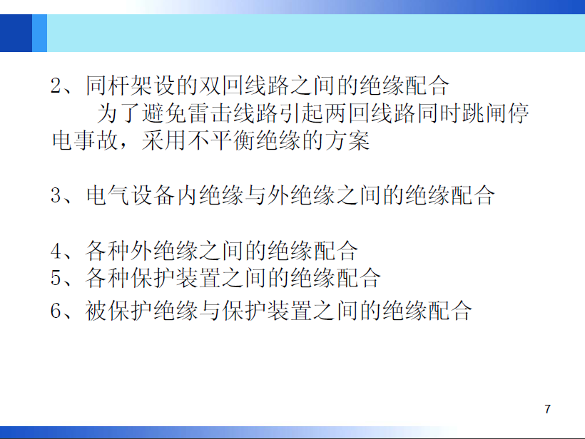 电力系统绝缘配合的根本任务是:正确处理过电压和绝缘这一对矛盾,以达到优质、安全、经济供电的目的。就绝缘配合算经济帐时,应该全面考虑投资费用、运行维护费用和事故损失等三个方面,以求优化总的经济指标。绝缘配合的核心问题是确定各种电气设备的绝缘水平,它是绝缘设计的首要前提,往往以各种耐压试验所用的试验电压值来表示。架空线路与变电所之间的绝缘配合:(1)电网发展早期,为了限制侵入变电所的过电压,线路绝缘水平低于变电所内的电气设备的绝缘水平;(2)MOA 或阀式避雷器的安装,可靠地限制侵入波的幅值,现代输电线路的绝缘水平高于变电设备