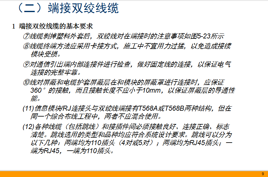 端接双绞线缆的基本要求:①端接双绞线缆前,必须核对线缆标识内容是否正确。②线缆中间不能有接头。③线缆终接处必须牢固、接触良好。④双绞电缆与连接器件连接应认准线号、线位色标,不得颠倒和错接。⑤端接时,每对对绞线应保持扭绞状态,线缆剥除外护套长度够端接即可,最大暴露双绞线长度为40-50mm,扭绞松开长度对于3类电缆不应大于75mm;对于5类电缆不应大于13mm;对于6类电缆应尽量保持扭绞状态,减小扭绞松开长度;7类布线系统采用非RJ45方式连接时,连接图应符合相关标准规定。