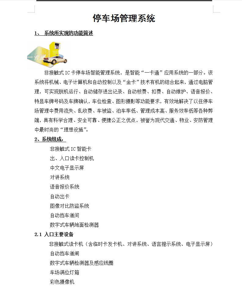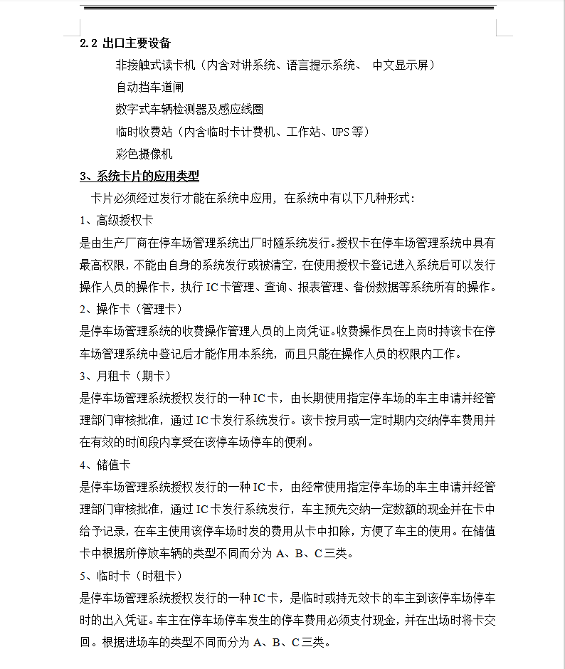 根据设计需要,本一卡通系统包含了停车场管理系统、门禁管理系统;本套IC卡系统可以实现集团员工、物业管理公司员工和商用客人在大楼内部的车库管理门锁权限、等楼内一卡通功能。