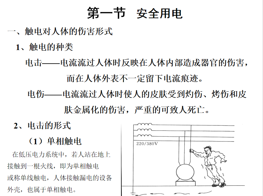 在低压电力系统中,若人站在地上接触到一根火线,即为单相触电或称单线触电,人体接触漏电的设备外壳,也属于单相触电。