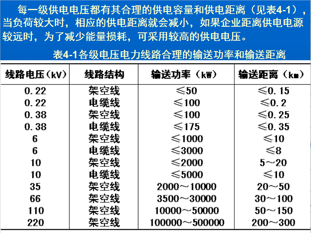 每一级供电电压都有其合理的供电容量和供电距离(见表4-1),当负荷较大时,相应的供电距离就会减小,如果企业距离供电电源较远时,为了减少能量损耗,可采用较高的供电电压。