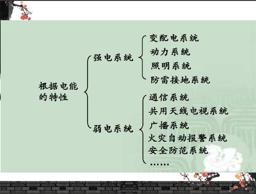 一般来说强电的处理对象是能源(电力)其特点是电压高、电流大、功率大、频率低,主要考虑的问题是减小损耗。提高效率及安全用电。弱电的处理对象主要是信息,即信息的传送与控制,其特点是电压低、电流小、功率小、频率高,主要考虑的问题是信息传送的效果,诸如信息传送的保真度、速度、广度和可靠性等。
