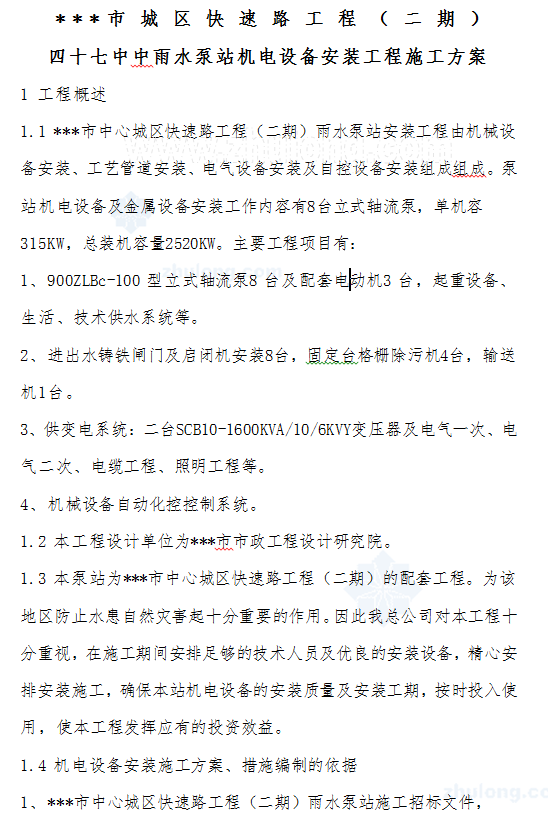***市中心城区快速路工程(二期)雨水泵站安装工程由机械设备安装、工艺管道安装、电气设备安装及自控设备安装组成组成。泵站机电设备及金属设备安装工作内容有8台立式轴流泵,单机容315KW,总装机容量2520KW。主要工程项目有: