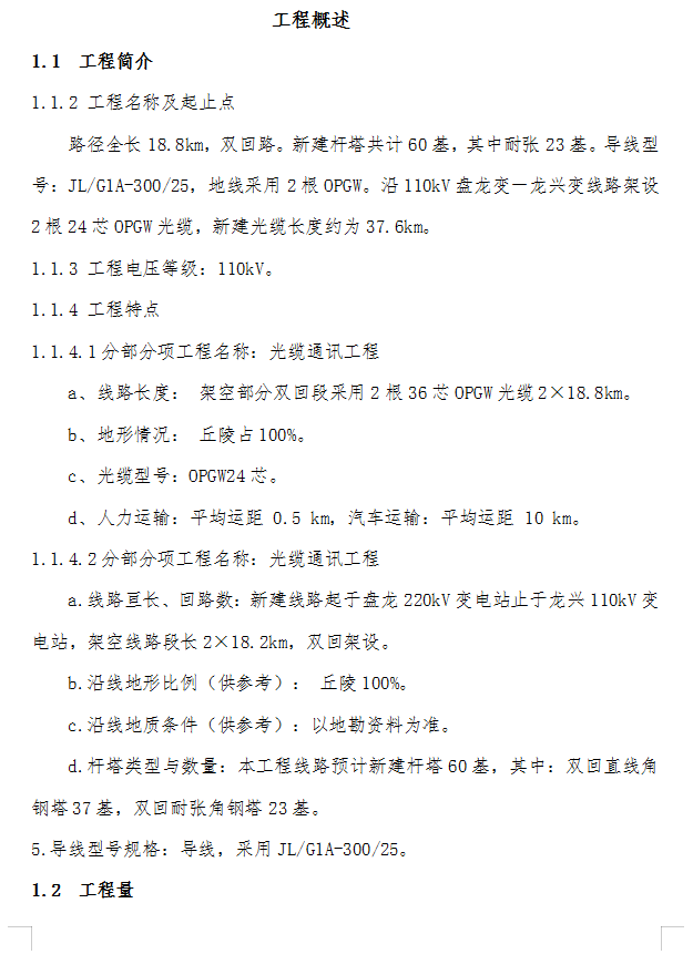 路径全长18.8km,双回路。新建杆塔共计60基,其中耐张23基。导线型号:JL/G1A-300/25,地线采用2根OPGW。沿110kV盘龙变-龙兴变线路架设2根24芯OPGW光缆,新建光缆长度约为37.6km。