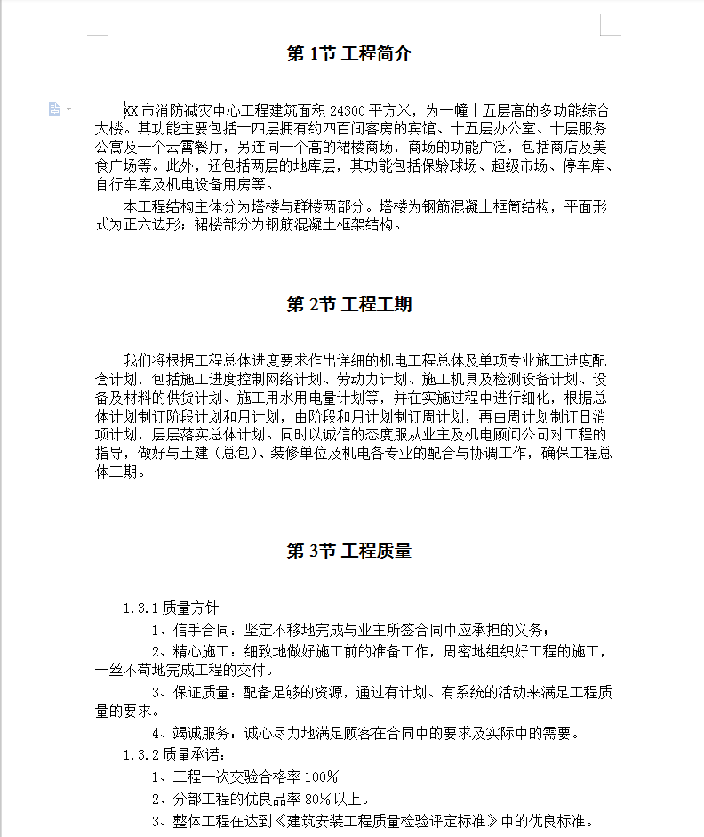 XX市消防减灾中心工程建筑面积24300平方米,为一幢十五层高的多功能综合大楼。其功能主要包括十四层拥有约四百间客房的宾馆、十五层办公室、十层服务公寓及一个云霄餐厅,另连同一个高的裙楼商场,商场的功能广泛,包括商店及美食广场等。此外,还包括两层的地库层,其功能包括保龄球场、超级市场、停车库、自行车库及机电设备用房等。