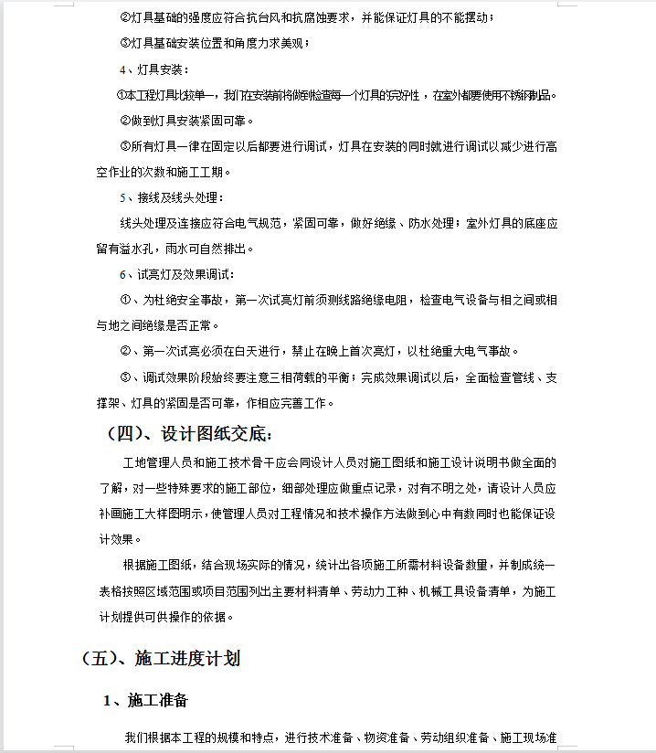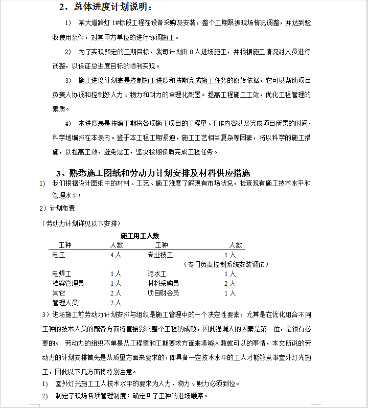 本大道为新修路段工程,路灯照明安装施工比较麻烦。工程规模较大,工期也较紧,施工工艺复杂,安装难度大,灯具安装数量多。首先我公司在官塘大道1#标段路灯照明安装工程施工期间,公司全体施工人员要服从甲方和监理方的管理监督工作。某大道1#标段路灯照明安装工程施工工期紧,并要达到验收使用要求。按照目前现场情况和工作情况来看,如果没有科学的统筹和必要的条件,实现预定的目标,就会存在一定的难度。因此,我们必须克服估计到的困难,在公司的统一指挥下,采用最符合道路施工的科学有效的施工方法,紧张有序的将各项工作贯彻始终,并尽量减少对大道交通的影响。